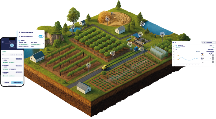 We have designed a comprehensive solution for efficient water management based on a cloud platform that uses autonomous, compact, solar-powered IoT devices to receive information, program the opening and closing of valves, and control irrigation devices remotely and in real time.