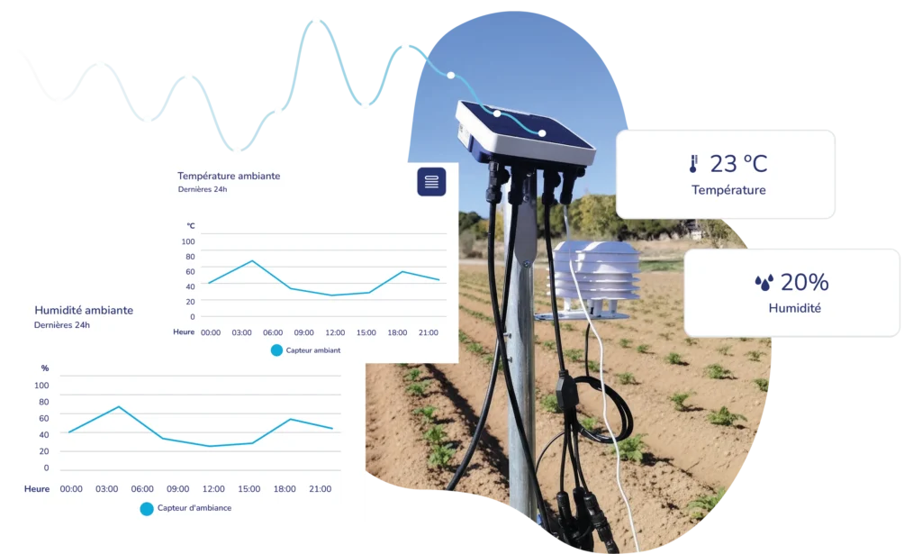 Les capteurs collectent des informations et les transmettent directement à la plateforme. Ils vous aident à économiser l’eau, l’énergie et le temps, tout en améliorant la qualité de vos cultures.