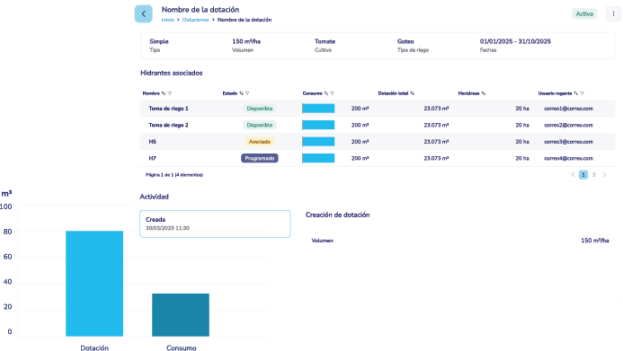 Depuis la plateforme, vous pouvez attribuer l’eau selon la disponibilité, le type de culture ou les besoins, et définir des limites journalières ou saisonnières.