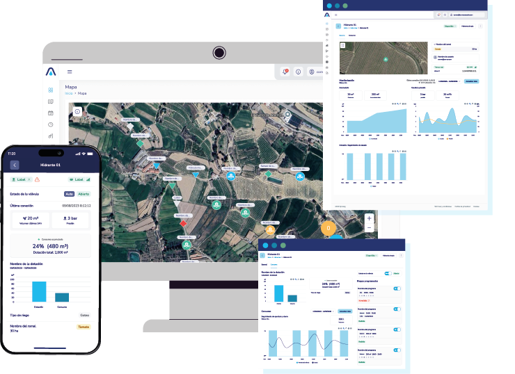 Notre plateforme centralise la surveillance, le contrôle à distance et la programmation des dispositifs Atlas, des éléments d’irrigation et des capteurs. Elle fournit également des informations détaillées et précises qui permettent d’optimiser la gestion de l’eau.
