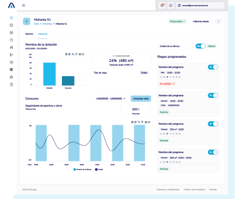 Surveillez le réseau, visualisez la consommation en temps réel, configurez les tours d’irrigation et contrôlez les alertes actives.