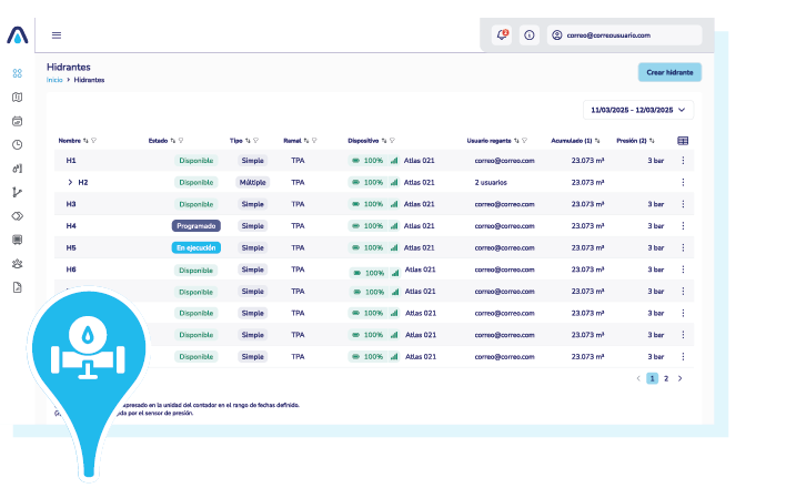 Depuis la plateforme, vous pouvez effectuer une télésurveillance réseau d’irrigation complète : supervision détaillée des bornes, des dispositifs Atlas associés, et des éléments connectés tels que vannes, compteurs ou entrées numériques.